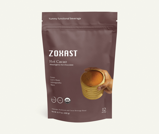 Hot Cacao is a blend of beneficial mushrooms, cacao, coconut sugar and ashwagandha to promote the focus + relaxation we need this holiday season. It tastes like rich cacao blended with the caramelized flavors of coconut sugar.